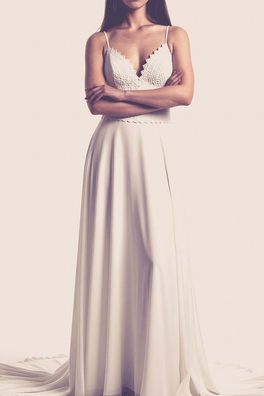 El Vestido Base tipo Recto es una prenda para novias caracterizada por su silueta simple y funcional. Mangas, escote y espalda personalizadas.