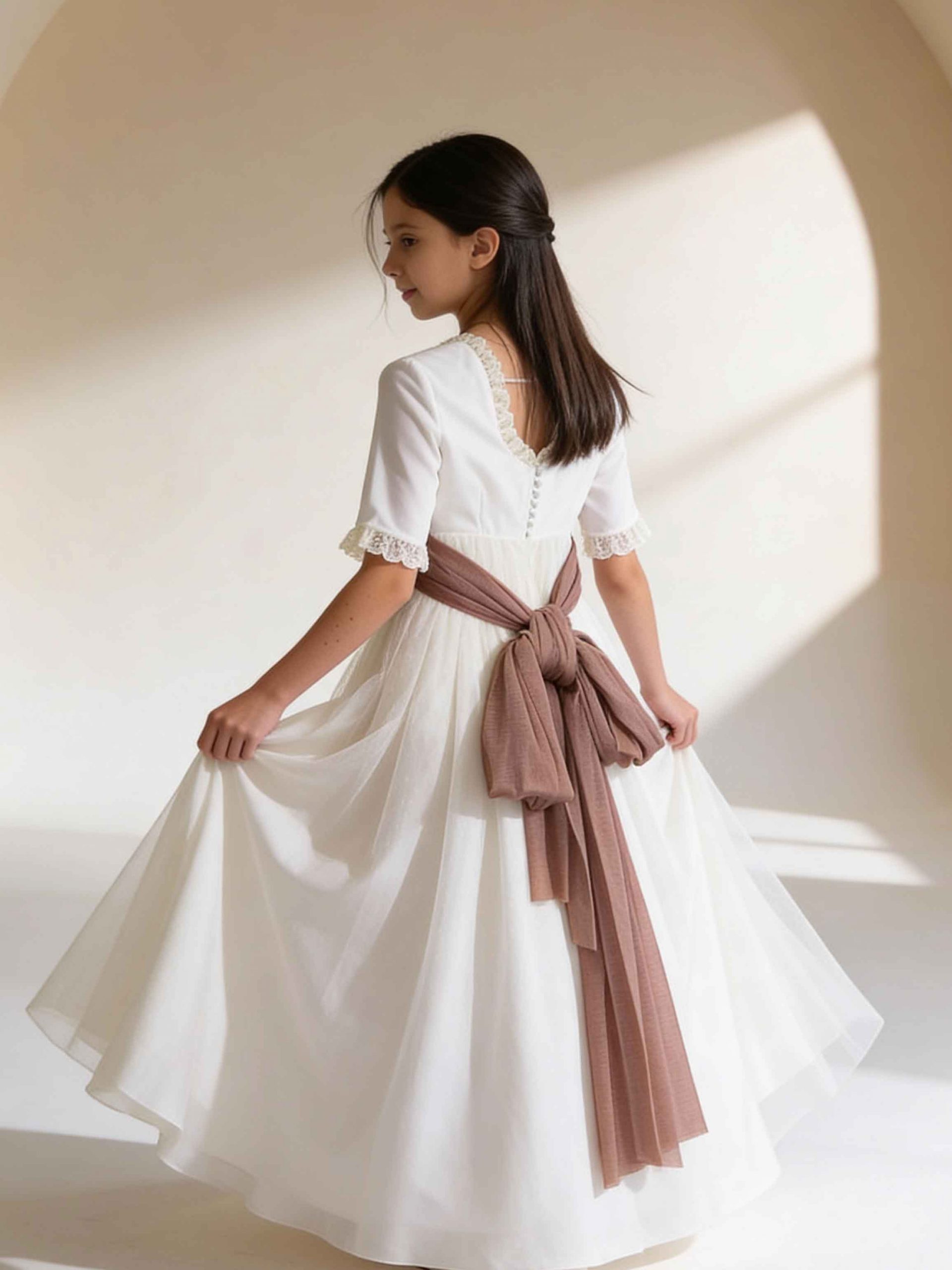 Vestido de comunión con mangas de tul liso, falda larga de tul liso, cuerpo de tul con una banda bordada en el escote redondo y espalda cerrada de tul. El tul es blanco marfil y está adornado con una cinturilla ancha color tostado.