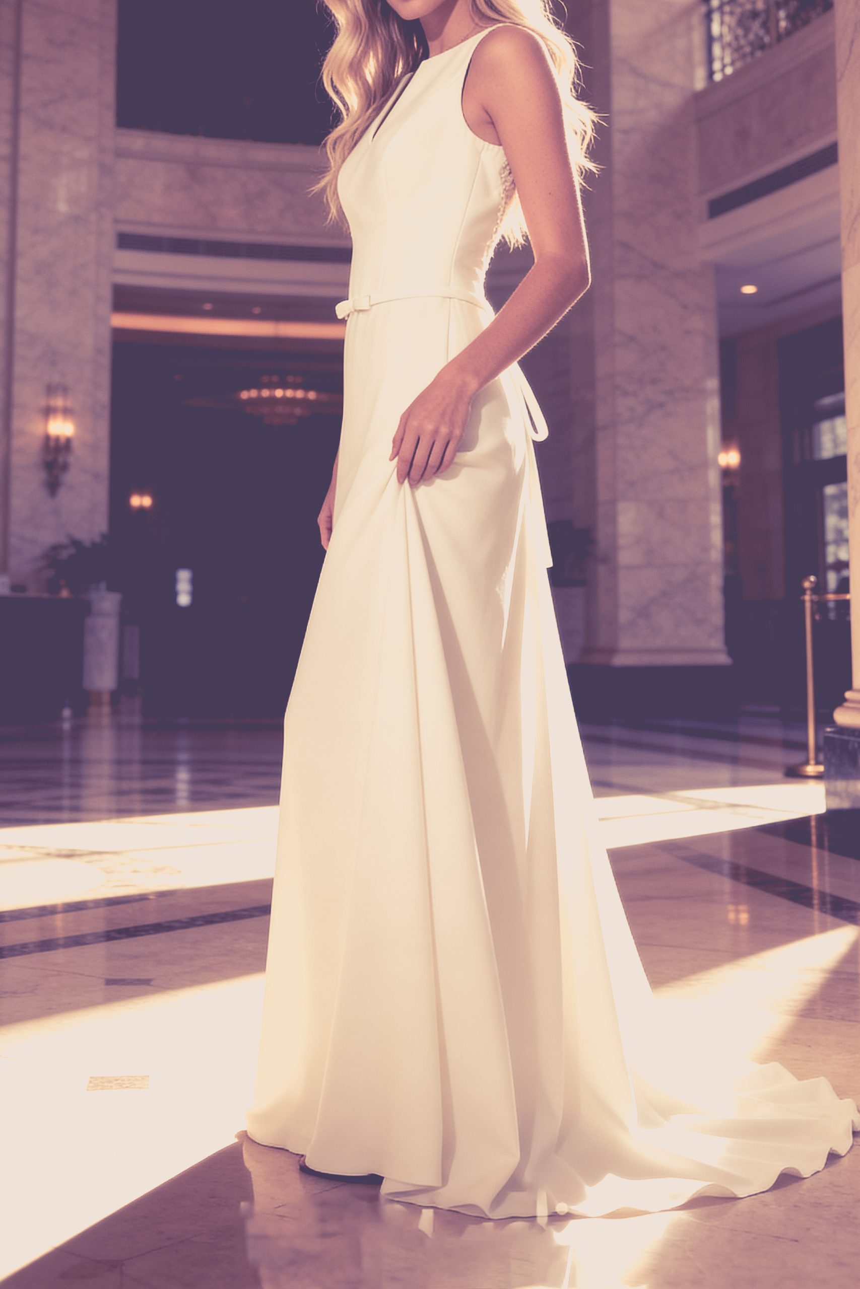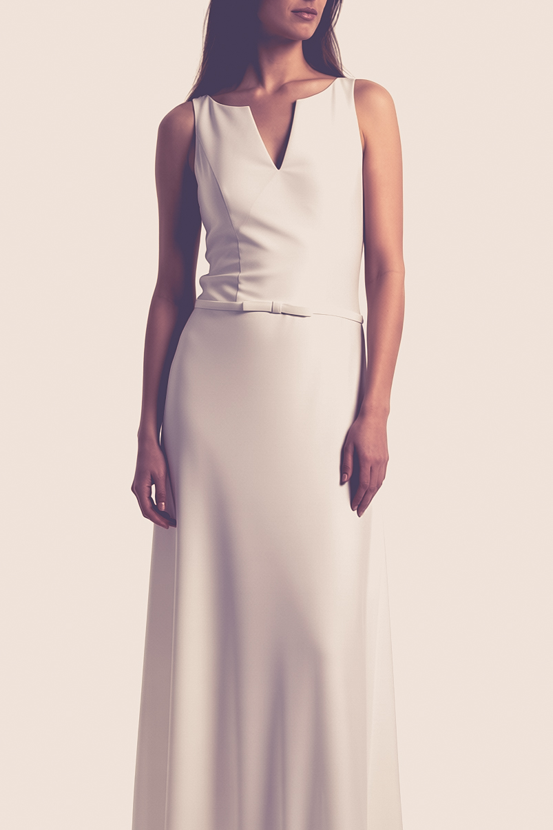 - Estructura sin mangas: Este diseño es una opción clave en AnaBlanca Novias para bodas civiles o eventos contemporáneos, proyectando una imagen pulida y ligera.