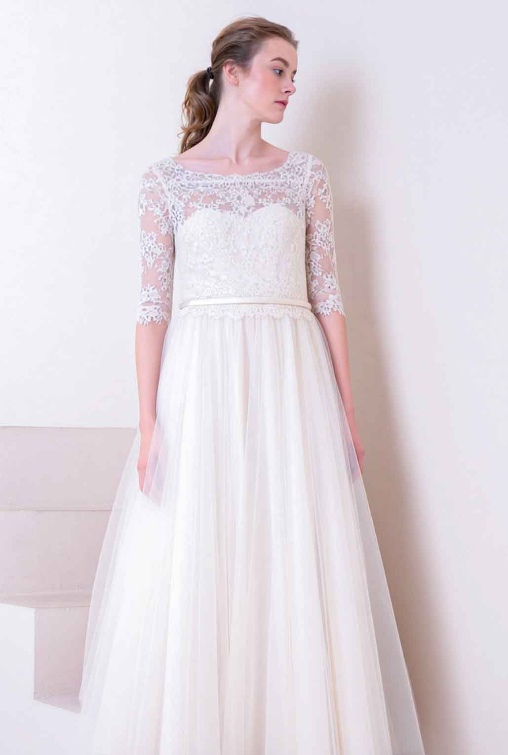 Vestido Base tipo Amur, para novias que buscan una silueta princesa, con telas de tul y encaje. Falda abierta tipo evasé y cintura fruncida. Mangas, escote y espalda personalizadas.